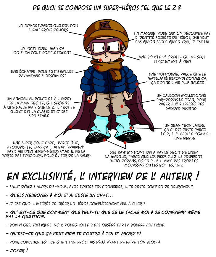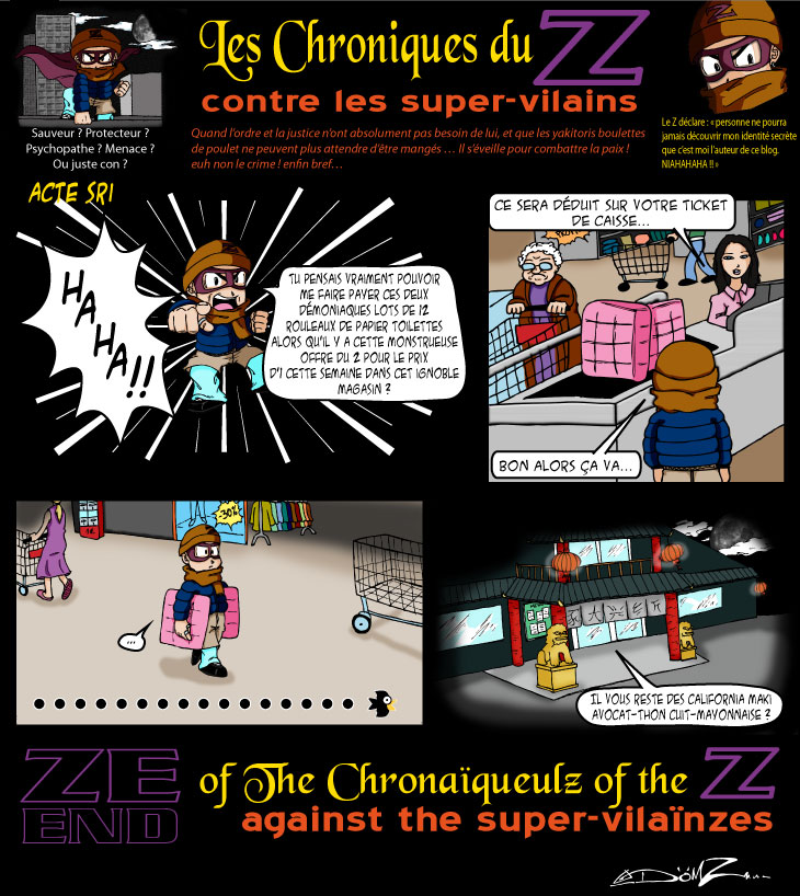 Vous en avez marre du Z, et d'ailleurs vous ne comprenez même pas pourquoi il existe ? Je vous rassure tout de suite, moi c'est pareil. En fait, je vais faire un break (voire complètement abandonner) de ces petites histoires. J'ai commencé un scénario plus long (oui parce que j'écris quand même toutes les conneries que je dessine, hallucinant non ?), une série à suivre du Z. Si vous n'êtes pas d'accord avec cette idée, bin vous pouvez protester, organiser des manifs ou encore brûler vos slips en signe d'indignation, allez-y ! Perso, je m'en fous complètement...