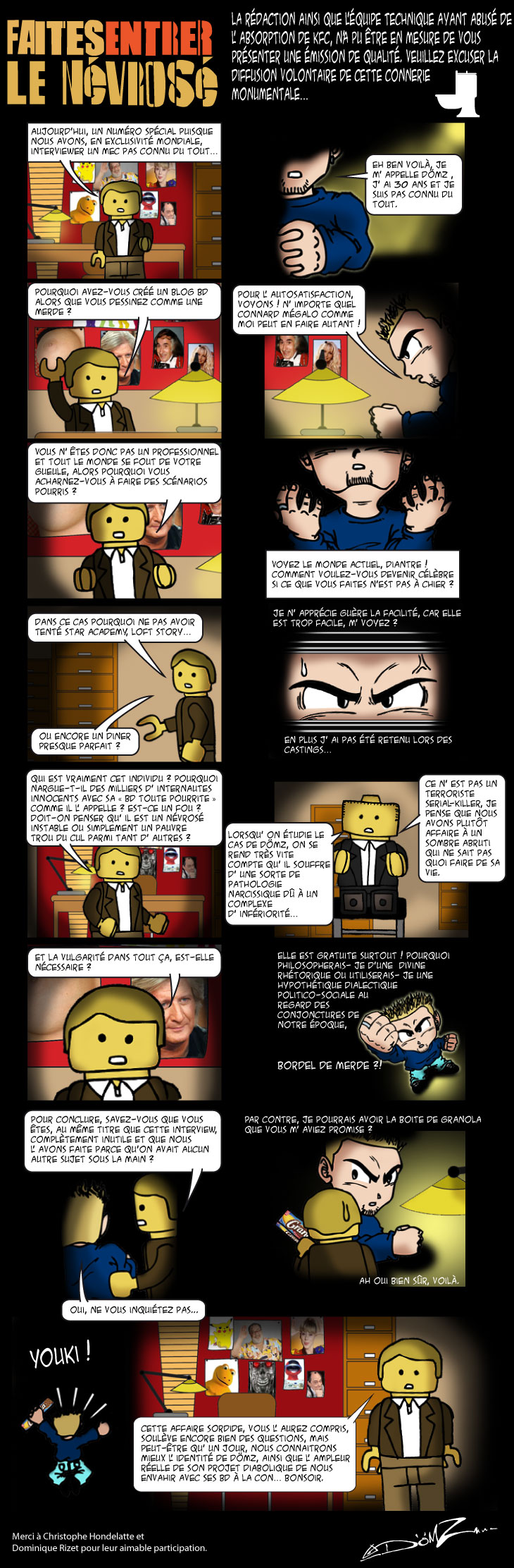 Donc voilà ce blog est un nouveau-né, son slogan c’est « la BD toute pourrite », et ça commence dès maintenant ! Tu comprendras tout de suite qu'il n'y a rien à comprendre : ni sens, ni logique, et encore moins de moralité à tirer. C'est con, vulgaire et pourri : c'est tout moi !(en fait, la toute première note était déjà assez naze, mais elle comptait pour du beurre)