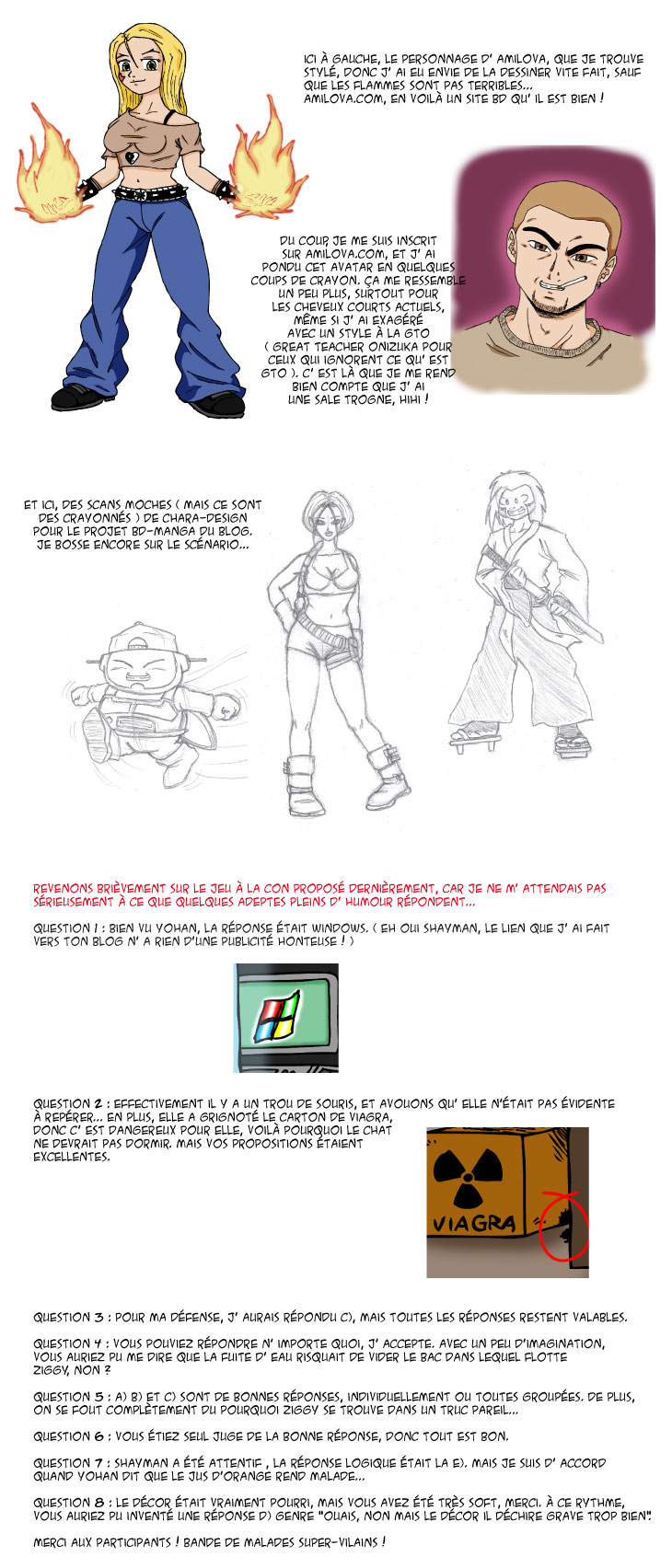 NIAHAHAHA !! Mon plan diabolique a fonctionné ! L'audimat du blog a pété, wéééé ! Bon, bien sûr, pour beaucoup de bloggeurs, le score paraitrait ridicule, mais ça fait plaisir d'avoir une centaine de visite dans la journée contre 5 à 10 régulièrement ! Bien sûr, si une star de la blogosphère BD comme MELAKA n'avait pas linké mon blog, les choses n'auraient pas changé, donc un milliard de remerciements à elle ne suffirait pas. Mais je reste aussi conscient que parmi cette foultitude d'internautes qui sont passés par là par curiosité, il est fort à parier que la plupart ne reviendront plus jamais, et comme je les comprend (bouhouhou...). Ensuite, merci à MALEC d'avoir répondu à mon mail, je vais pouvoir m'initier au turbomedia grâce à lui (prochainement hein... j'y travaille). Mille mercis aux lecteurs et commentateurs, c'est vous les meilleurs. Si vous aimez la BD, allez donc jeter un oeil sur le site AMILOVA, c'est très très bon ! Donc aujourd'hui, pas de note à proprement parler, mais de la participation active en bas de page, à ne pas rater, merci Shayman !
