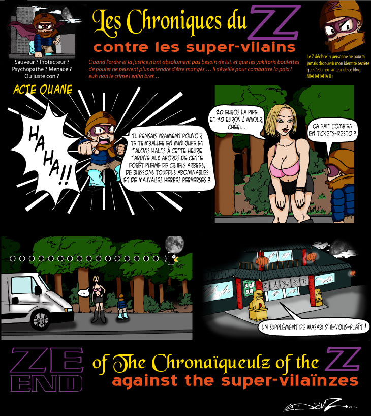 Vous tous super-vilains, tremblez ! Il y a un nouveau super-héros en ville ! On l'appelle le Z ! Par contre, ne comptez pas sur lui pour vous sauver, parce que ses supers-pouvoirs ne lui permettent pas de le faire pour le moment. Donc, si danger il y a, veuillez renouveler votre appel ultérieurement...
