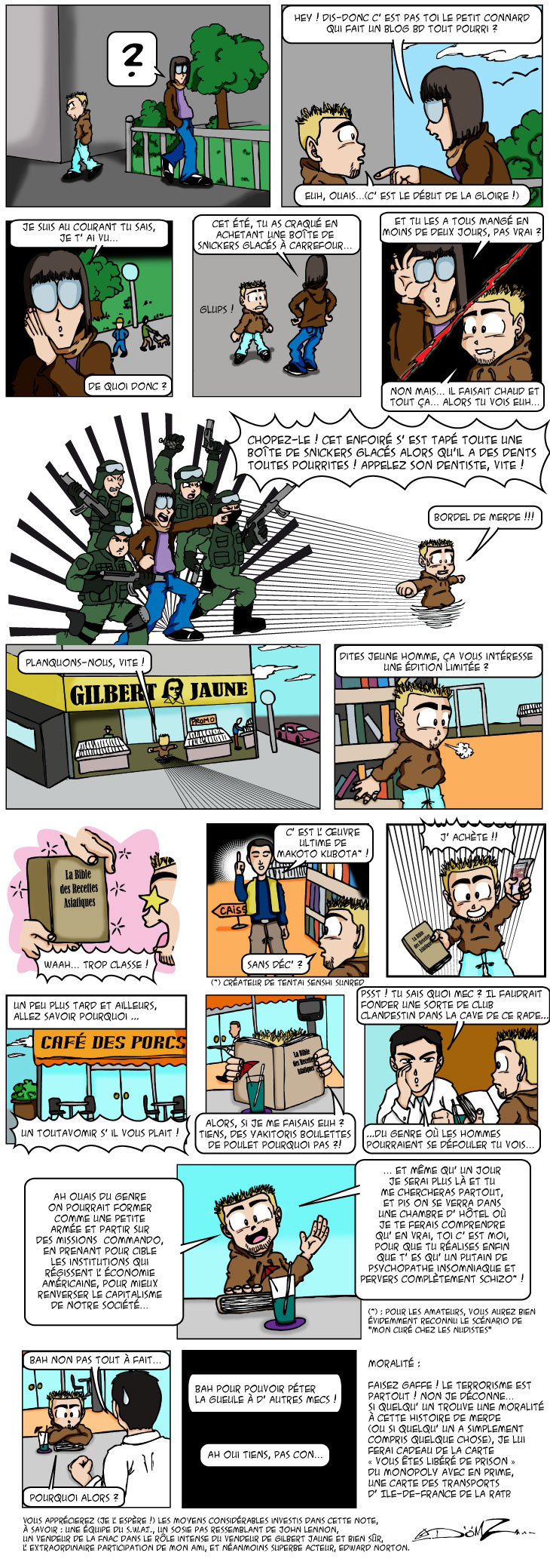 Bon alors que dire ? Vous savez que faire de la bd pourrite ça demande du temps, du travail et de la réflexion ? J'ai mis 3 heures à élaborer ce scénario et près de 15 heures à sa conception, et je commence à avoir tendance à pencher vers des histoires plus longues, plus construites... Vous l'aurez compris bien sûr, je ne vous raconte que des conneries !