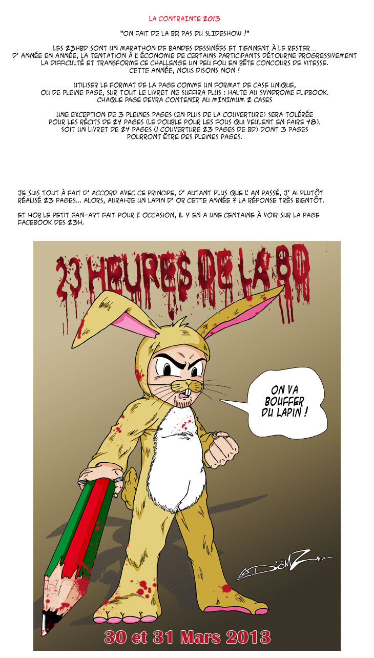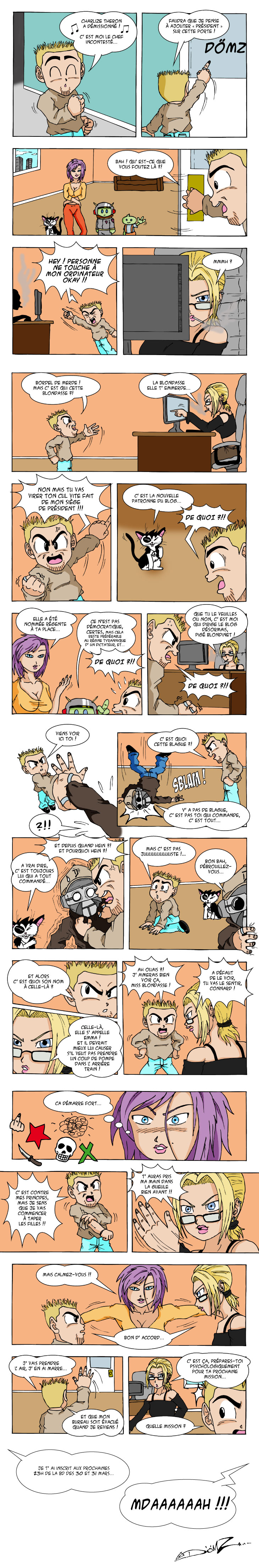 Oh miracle ! Alors comme ça DömZ n’a pas déserté le blog ? Eh ben non, je suis toujours là ! Bon, pas mal absent, il faut bien l’avouer… Pour tout dire, j’ai très peu dessiné ces derniers temps. J’ai commencé ma BD, mais je me suis vite rendu compte dans mes brouillons que ce n’était pas assez bien, je dois encore bosser sur l’histoire. Eh oui, parce que faire une BD crétine, c’est bien joli, encore faut-il donner envie aux lecteurs de tourner les pages… Du coup, je vous livre ici une petite note (enfin 4 pages quand même !) faite rapidos ce dimanche (donc bon, la qualité…) avec une bonne colorisation à l’arrache. J’espère que malgré tout, vous continuerez à venir ici, et je vous dis rendez-vous en Avril, parce que le week-end prochain sera chargé…