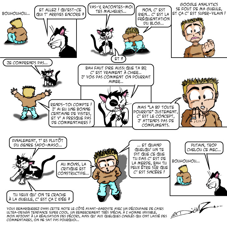 Oui, oui, oui j'ai honte de moi ! On plonge directement dans la note à l'arrache dessinée avec les pieds. C'était pas prévu dans mon planning de blog ultra pas organisé, et qui n'existe pas d'ailleurs... Le seul point positif, c'est que j'ai jamais fait une note aussi vite ! Alors dessins pourris, colorisation rapide au pinceau, décors inexistants (au moins ils ne seront pas de travers...), et tout ça pour quoi ? Bah pour rien, comme d'hab'. En fait, j'ai pris un peu de retard sur la note que je voulais poster, mais accrochez-vous parce que je bosse comme un dingue pour réaliser des dessins de qualité, avec des caricatures de stars, des décors de folie et de l'action digne des mangas ! Et comme vous vous en doutez, ce n'est absolument pas vrai... Quant à cette note, elle est archi-fausse, peu importe les commentaires, d'ailleurs le blog n'a pas encore un mois d'existence.